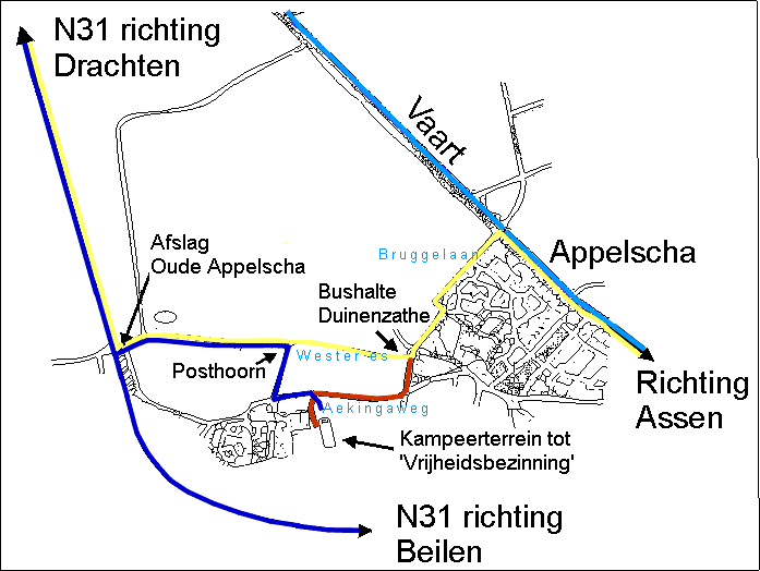 Met de auto (de donkerblauwe route): op de N31 (Drachten - Beilen) neem je afslag Oud-Appelscha;